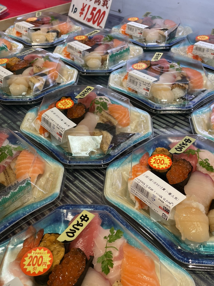일본+백화점 = 퀄리티가 보장되는 맛있는 회와 초밥이 산더미처럼. 거기다가 일본 백화점도 마감시간은 할인을 한다.