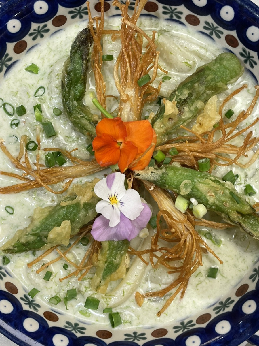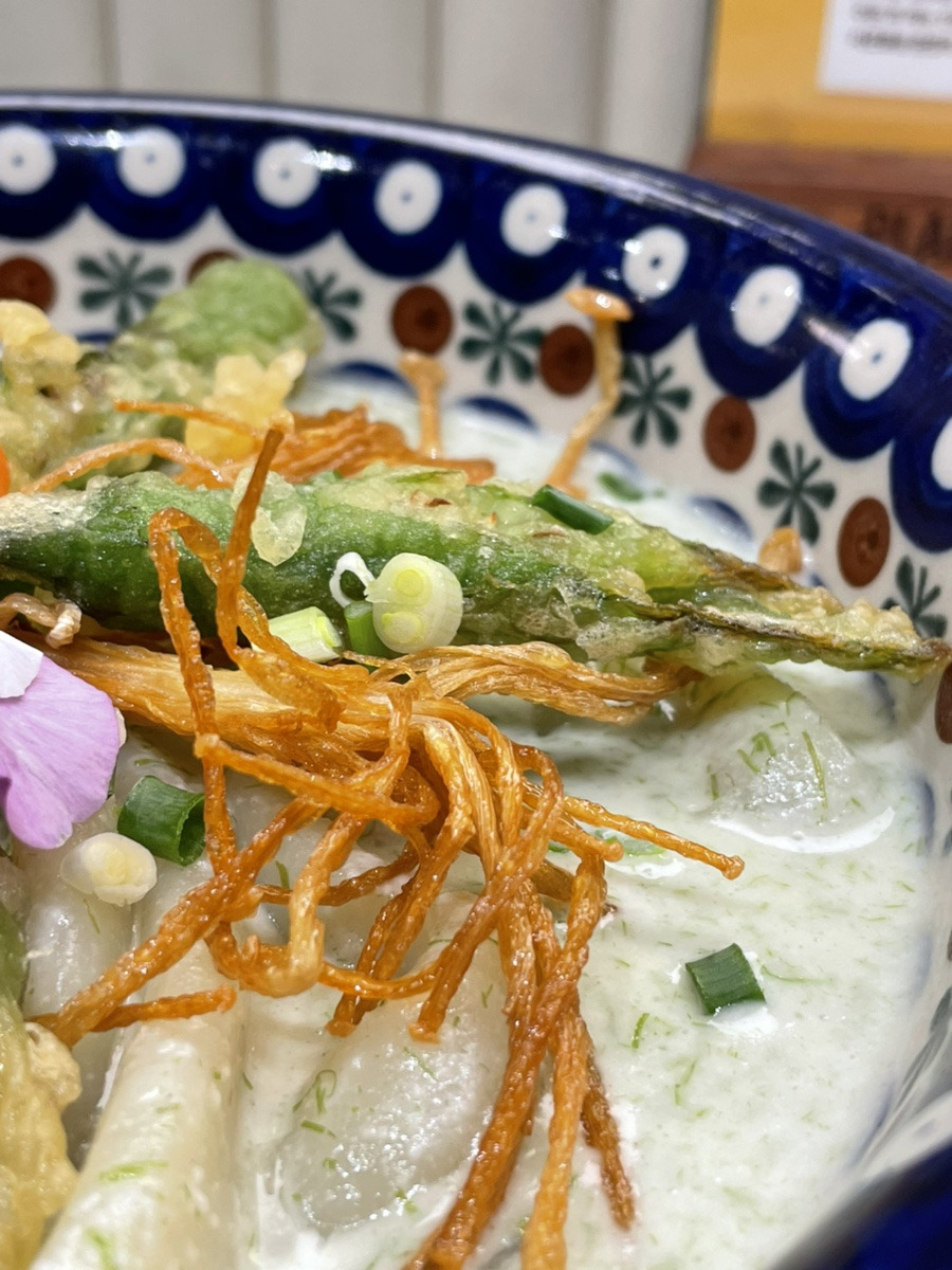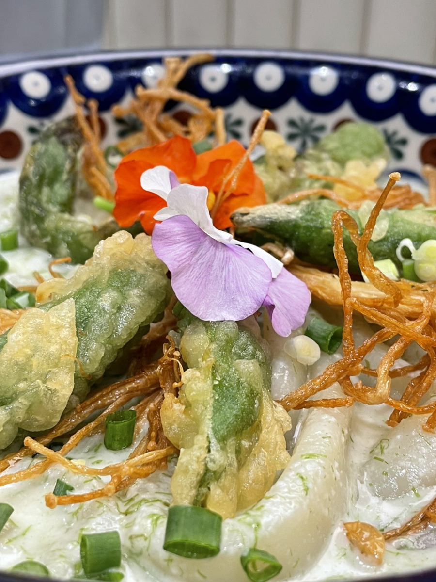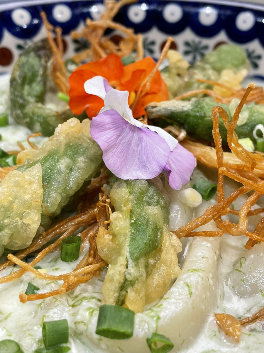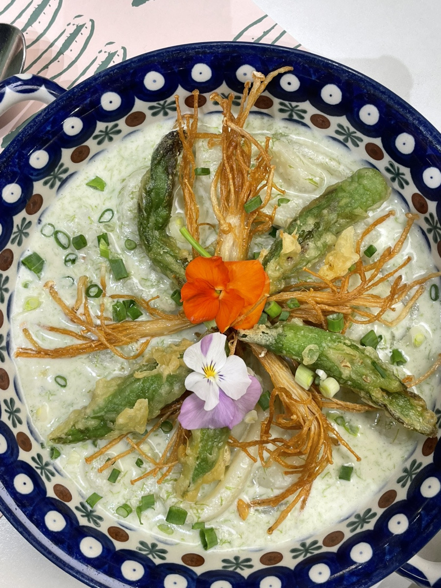 화려한 비주얼과 함께 감태와 조화로운 짭조롬한 크림떡볶이! 넓게 감싸는 트러플 향과 바삭한 팽이버섯튀김, 고추튀김이 일품이다.