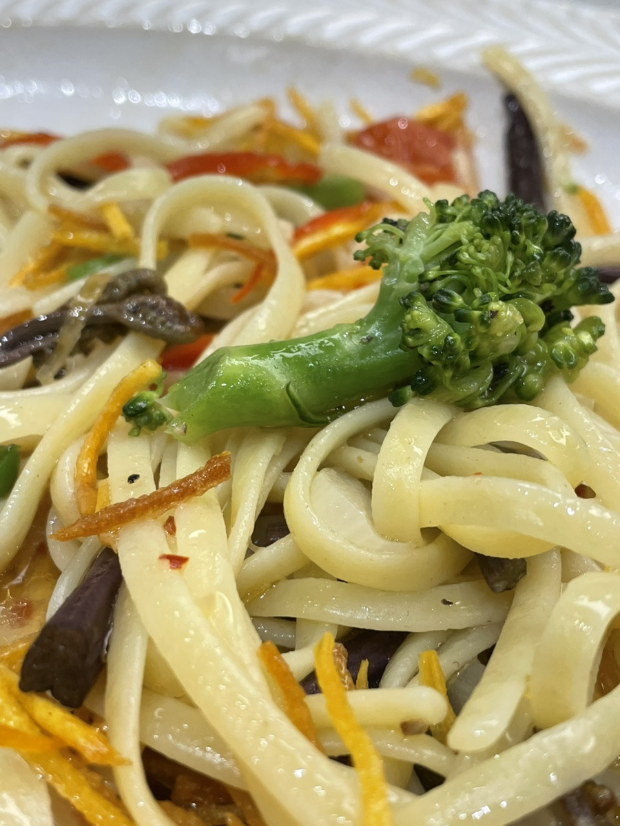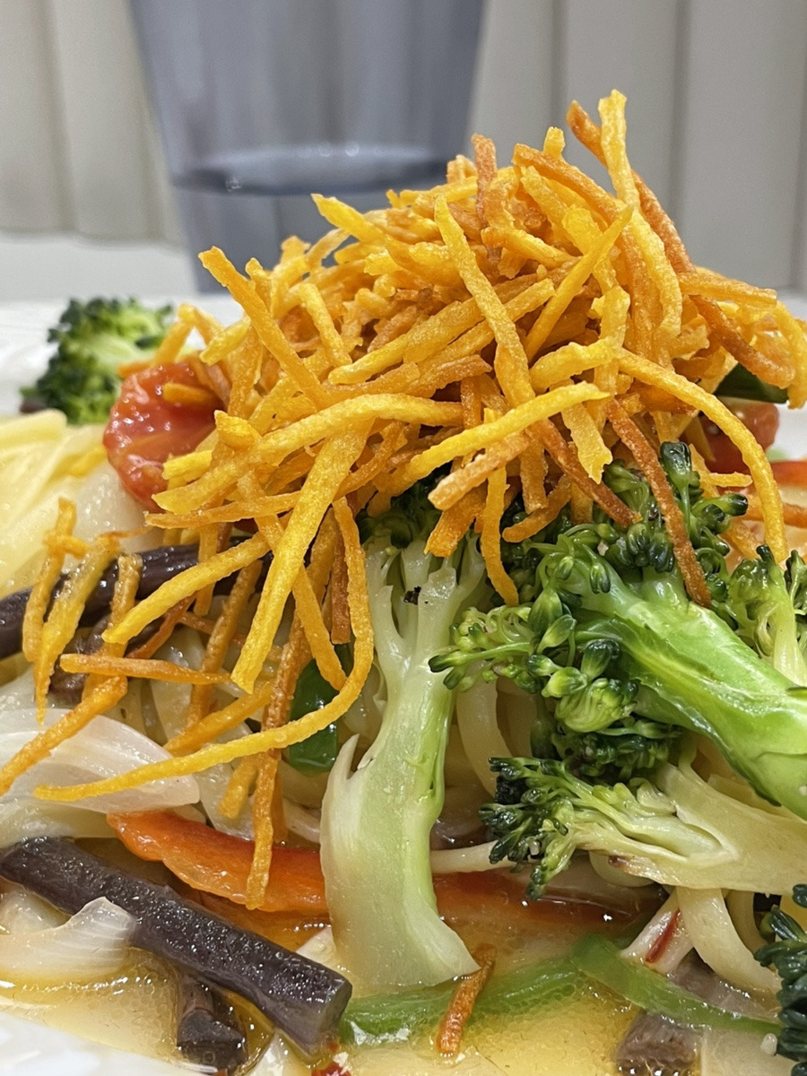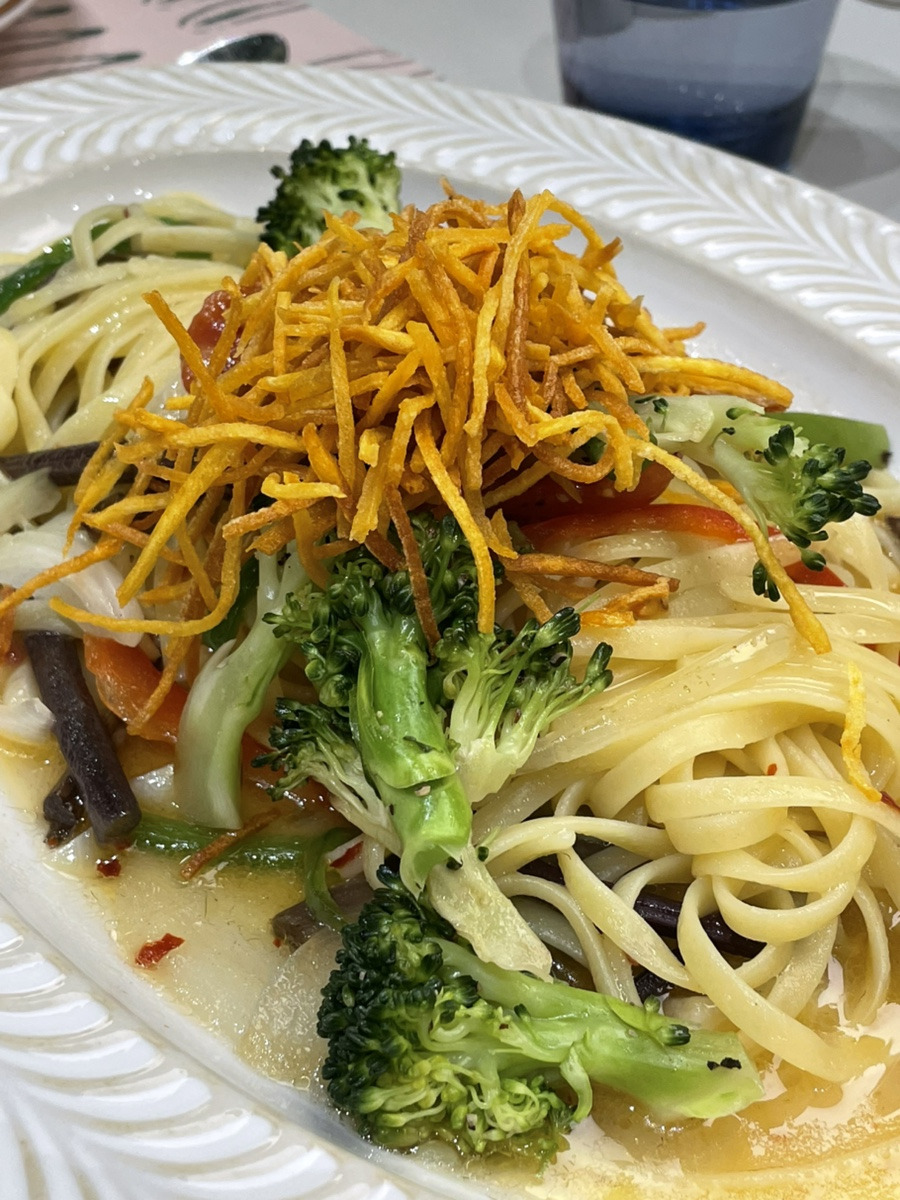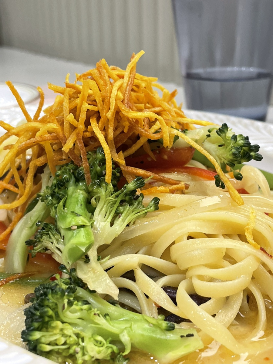 잘 삶아진 브로콜리, 고사리, 다양한 야채 종류와 알단테 기가막힌 파스타. 그리고 마지막에 위에 올라간 바삭바삭 고구마채 튀김 까지.