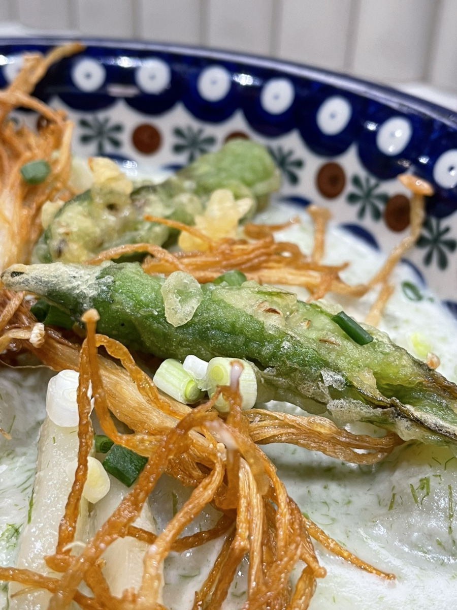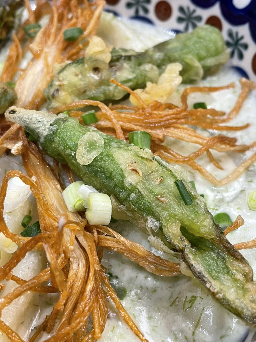 바짝 튀긴 팽이버섯과 고추튀김의 매콤함이 잘 어울리면서, 감태가 낭낭하게 들어간 화이트크림 치즈가 짭조롬하게 너무나 잘 어울린다.