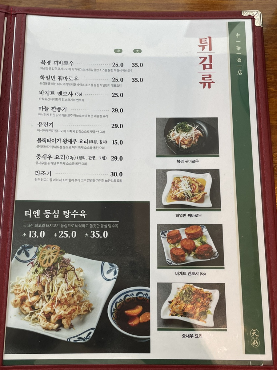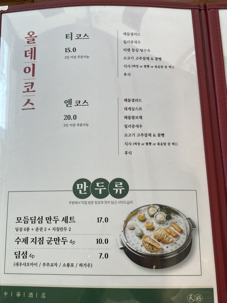 티와 엔 코스는 1만5천원, 그리고 2만원대로 메뉴도 칠리중새우, 등심탕수육, 소고기 고추잡채, 식사에 후식까지 가성비가 좋다.