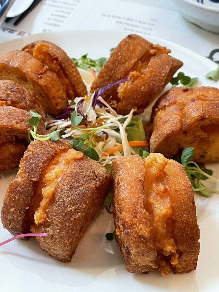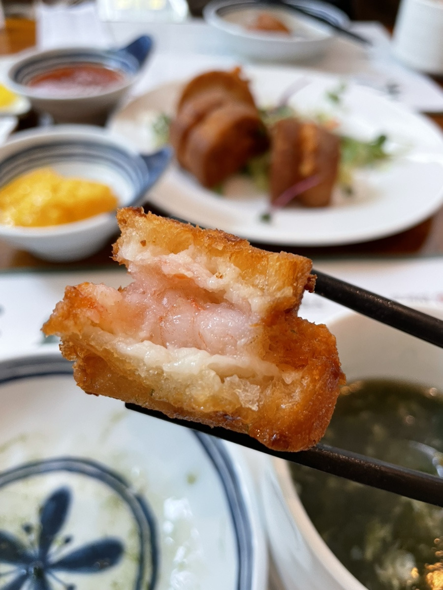 멘보샤는 통새우와 함께 갈린 새우가 빵 사이에 들어가서 너무나 맛있게 튀겨졌다.