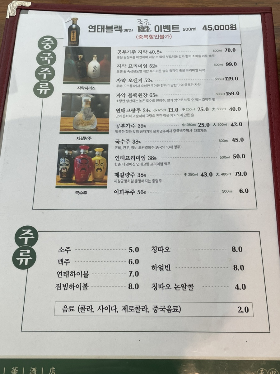 자약시리즈, 제갈량주, 국수주 등 다양한 백주 와 소주, 맥주, 하이볼 등도 준비되어 있다.