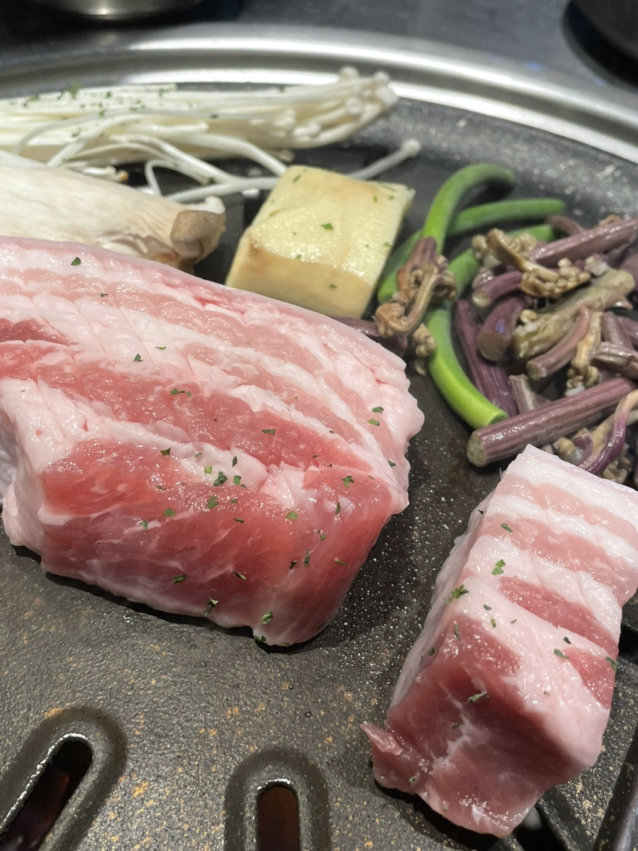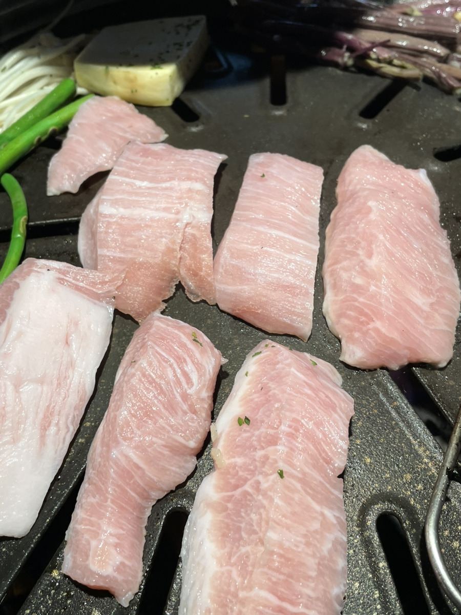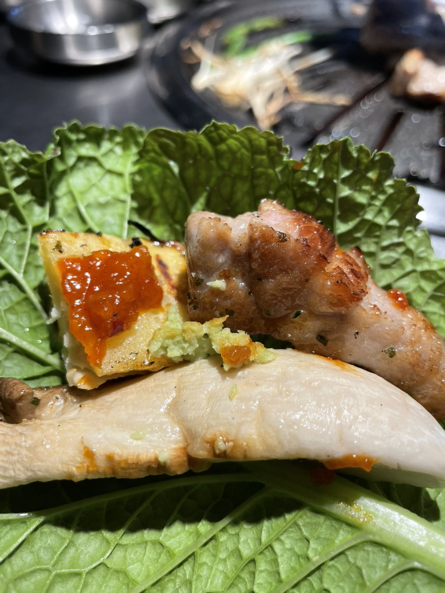 부드러운 육질과 겉면의 마이야르가 잘 어울려서 육즙팡팡이다. 함께 구운 고사리, 버섯을 쌈에 같이 싸먹으면 너무나 맛있는 신당육 삼겹살 이다.