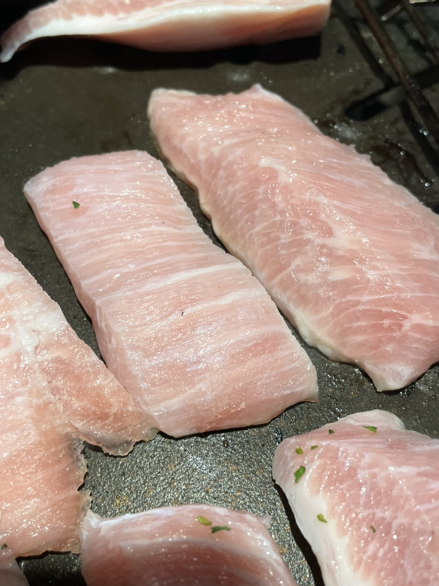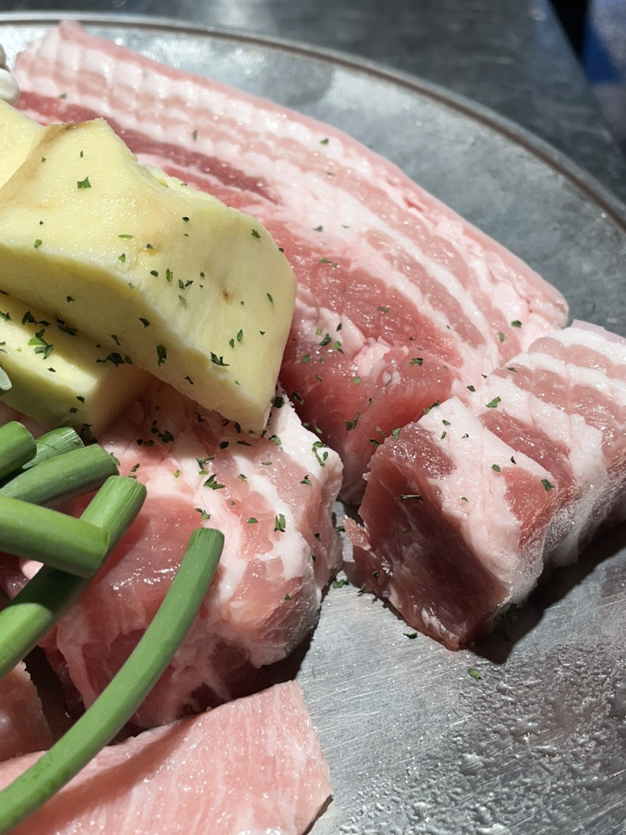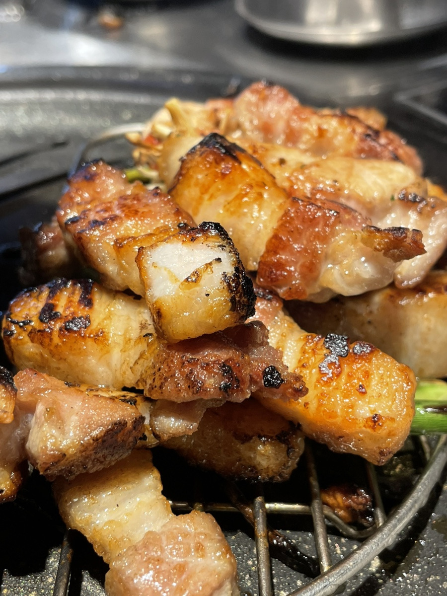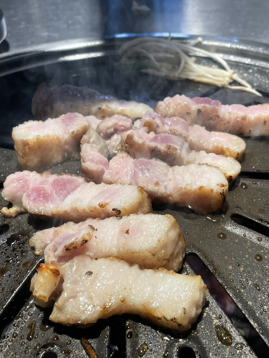 부드러운 육질과 겉면의 마이야르가 잘 어울려서 육즙팡팡이다. 함께 구운 고사리, 버섯을 쌈에 같이 싸먹으면 너무나 맛있는 신당육 삼겹살 이다.