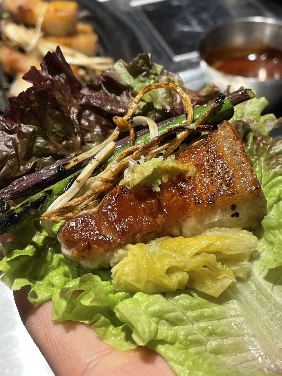 함께 구운 고구마, 마늘쫑, 고사리를 쌈과 함께 싸먹으면 고소하면서도 꼬들꼬들 항정살만의 식감이 더욱 살아나는 즐거움이 있다.