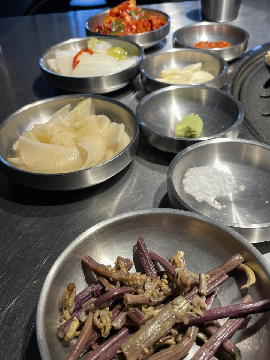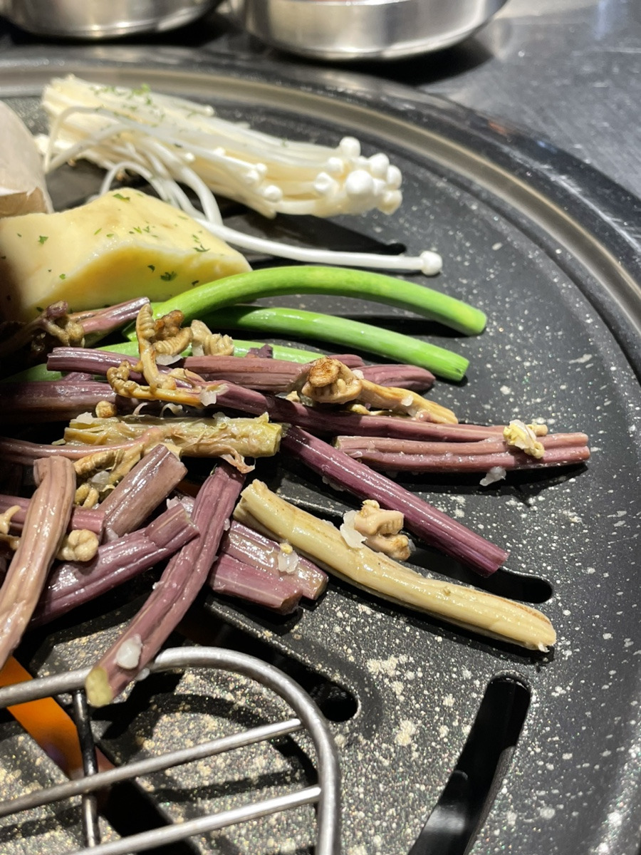 같이 나온 고구마, 버섯, 마늘쫑, 고사리도 불판위로 올라가서 함께 맛있게 구워질 예정이고, 신선하고 깔끔한 밑반찬들과 파+양파절이가 고기의 맛을 더욱 풍성하고 맛있게 만들 예정이다.