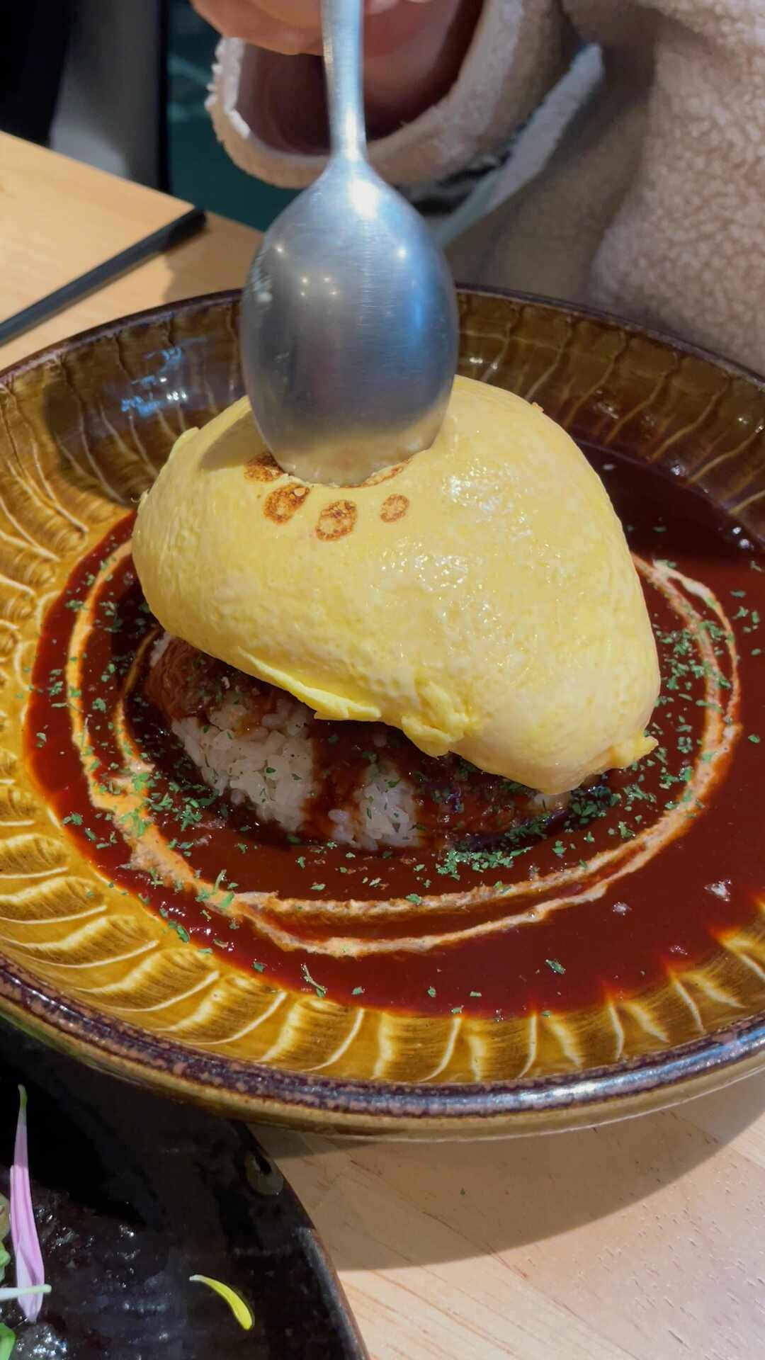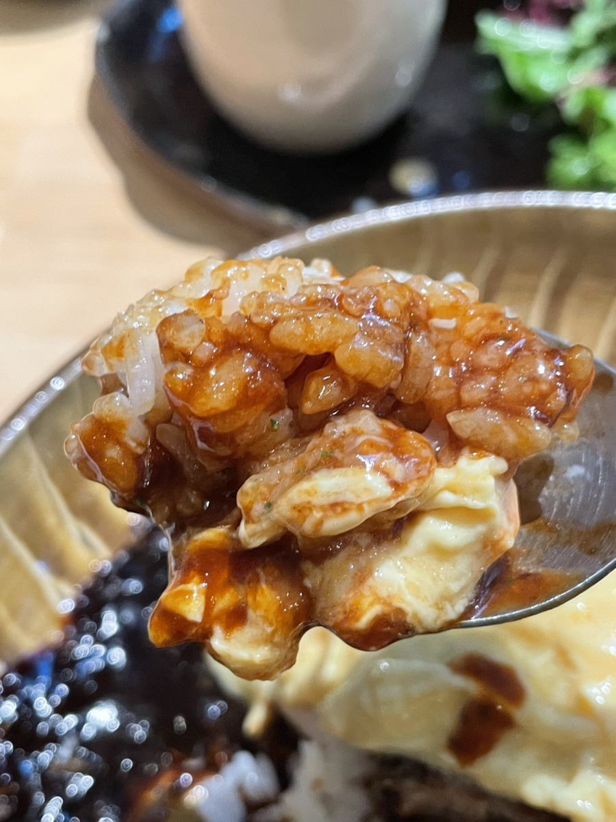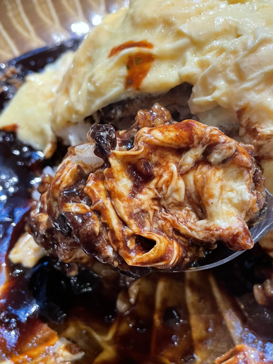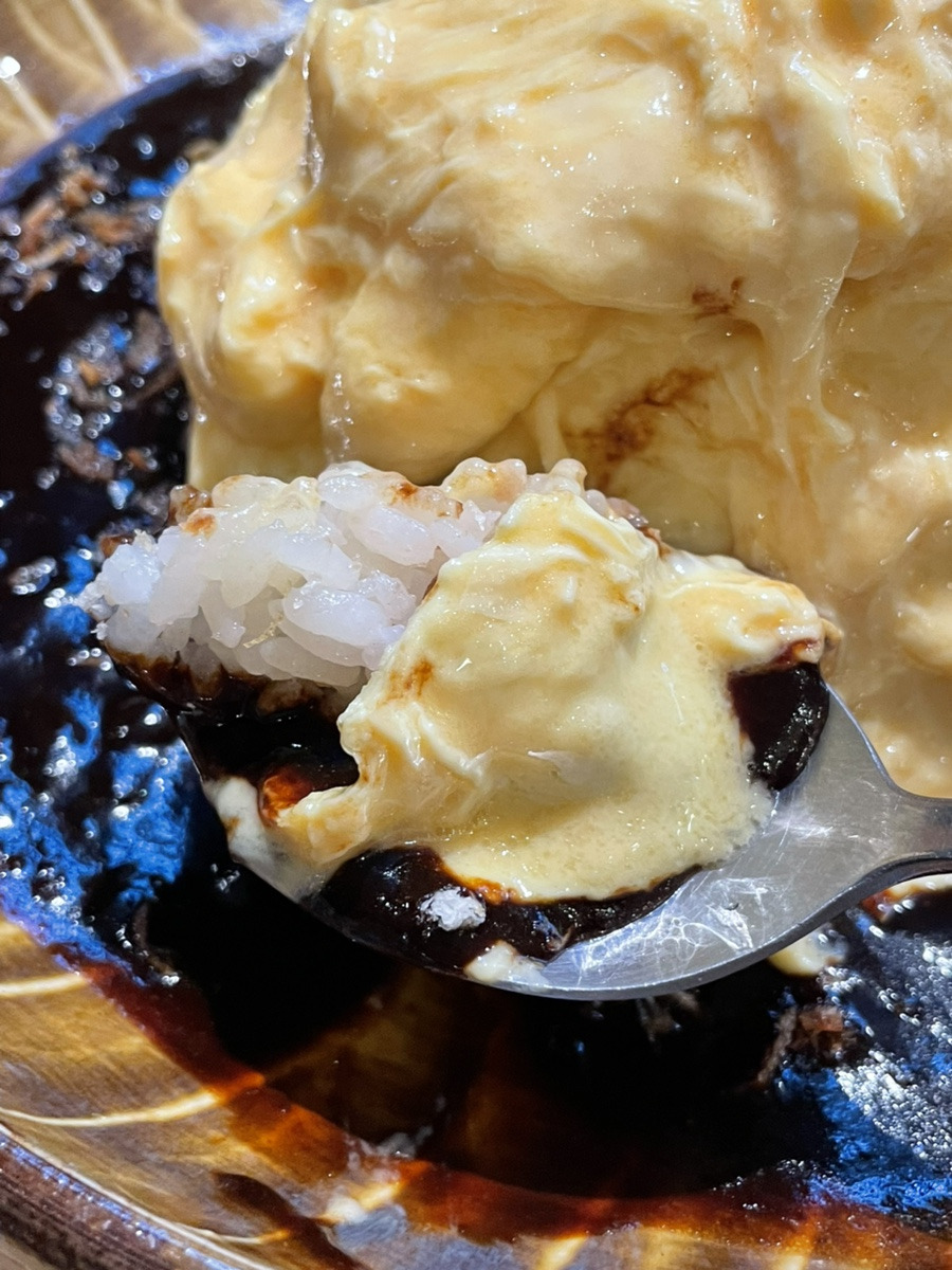 퍽퍽하지 않고 두툼한 함박스테이크가 보들보들한 오므라이스 이불을 덮고 입 안으로 들어온다.