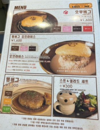 오무버그, 햄버그오므라이스, 오므라이스, 햄버그, 스프와 샐러드 이렇게 심플하게 구성되어 있어서 고르는데 어려움이 없다.