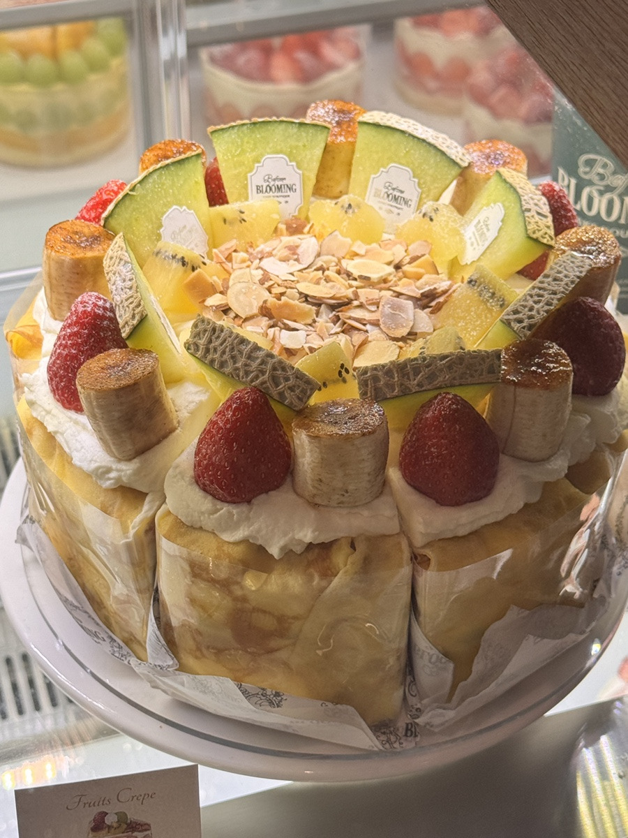 노란 빛깔의 두툼한 비주얼이 인상적이고 메론, 딸기, 바나나과일이 올라간 가장화려한 크레이프 케이크!