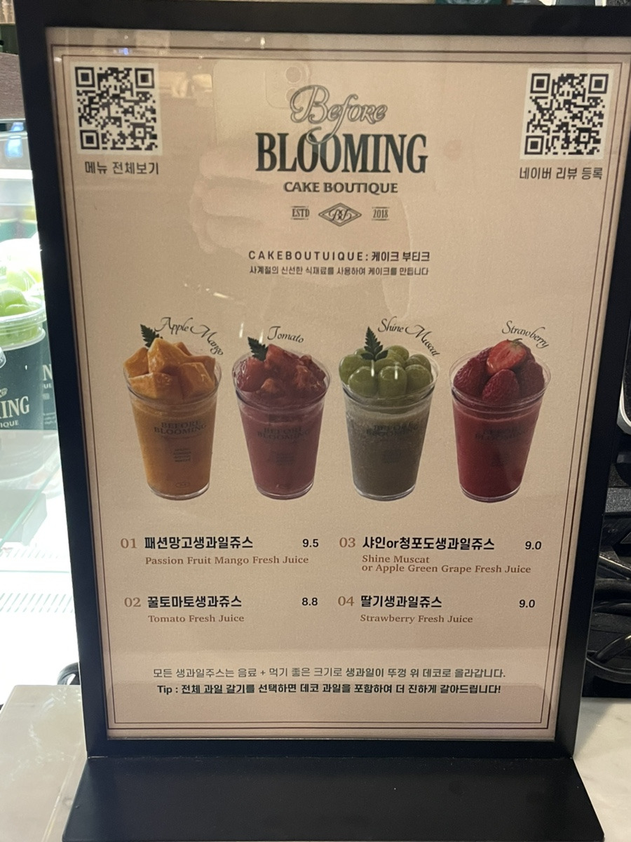비포블루밍은 제철에 맞는 신선한 식재료를 사용하는 압구정 케이크 맛집이자 생과일주스 맛집이다.