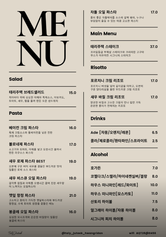 주 메뉴는 파스타와 스테이크, 리조또! 그리고 알콜메뉴들!
